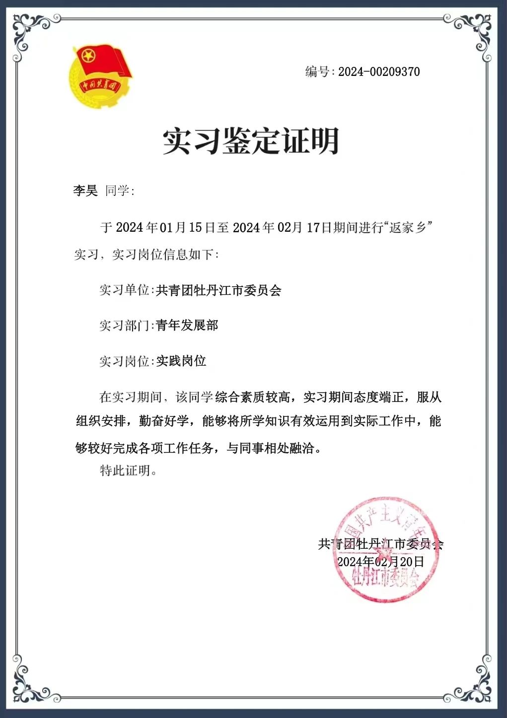 李昊虽然只实习了一个月的时间,但是这一个月能带给他的已超过实践本身,在本次寒假冬捕和返家乡社会实践中李昊同学学会了付出与奉献,明白志愿服务所带来的意义,对牡丹江的发展也有了不同角度和更深层次的认识,希望在今后用自己的能力为家乡冰雪旅游作出贡献。青春当自强,奋斗正当时,纵使万水千山,依旧坚韧跋涉;纵使前路坎坷,依旧无畏前行。他依旧坚信,拼搏过后,始终热爱,定会拥抱属于自己的那份光。