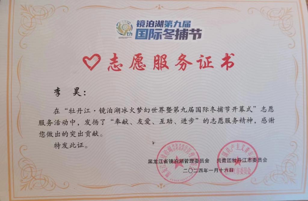 为响应我校团委号召,助力丹江冰雪旅游发展,在得知牡丹江市冰雪旅游活动招募志愿者时第一临床医学院李昊第一时间报名参加了“镜泊湖冰雪梦幻世界暨第九届国际冬捕节”开幕式当中,主要工作是接待外地来镜泊湖的游客们,带领游客参观冬捕现场和吊水楼瀑布等工作,每天在零下四十度的湖面上站近10小时。