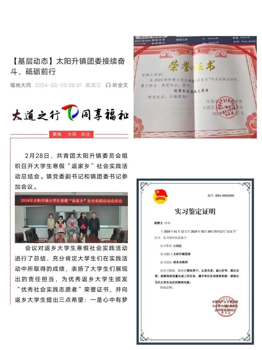 “重实践、知行合一”,“端正择业观念,精准定位,在社会的广阔天地大显身手”是习近平总书记对当代大学生的嘱咐。为响应我校团委号召,助力乡村振兴发展。此次寒假期间,牡丹江医学院第一临床医学院21级检验2班徐静文同学通过报名共青团组织大学生“返家乡”社会实践活动,在2024年1月12日-2024年2月9日,到大庆市大同区太阳升镇政府进行政务实习。主要工作是学习乡村网格管理体系,配合团委工作,宣传防诈骗,消防安全,医保知识等相关活动,提高人民的安全意识,助力乡村振兴。