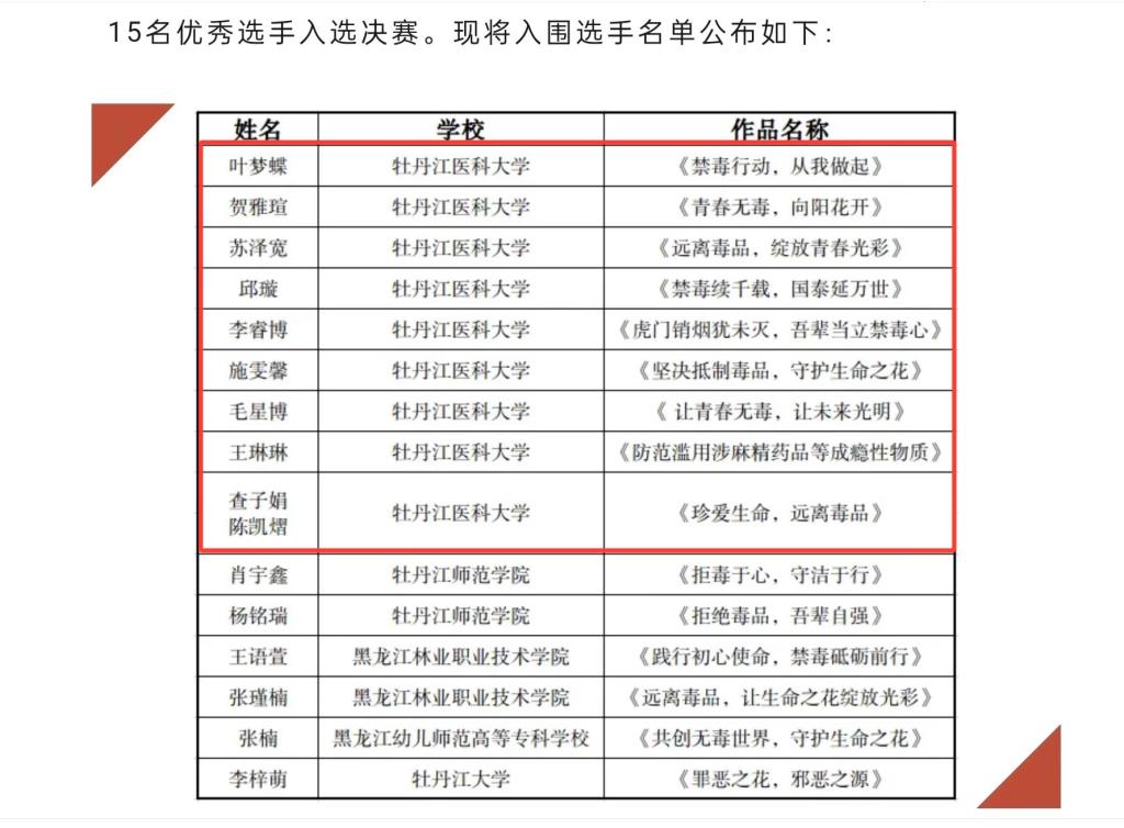 近日,由牡丹江市禁毒委员会办公室、共青团牡丹江市委员会联合举办的“防范滥用涉麻精药品等成瘾性物质”牡丹江市大学生禁毒主题演讲比赛初选已落下帷幕,我校共9组优秀选手成功入围15强进入决赛。