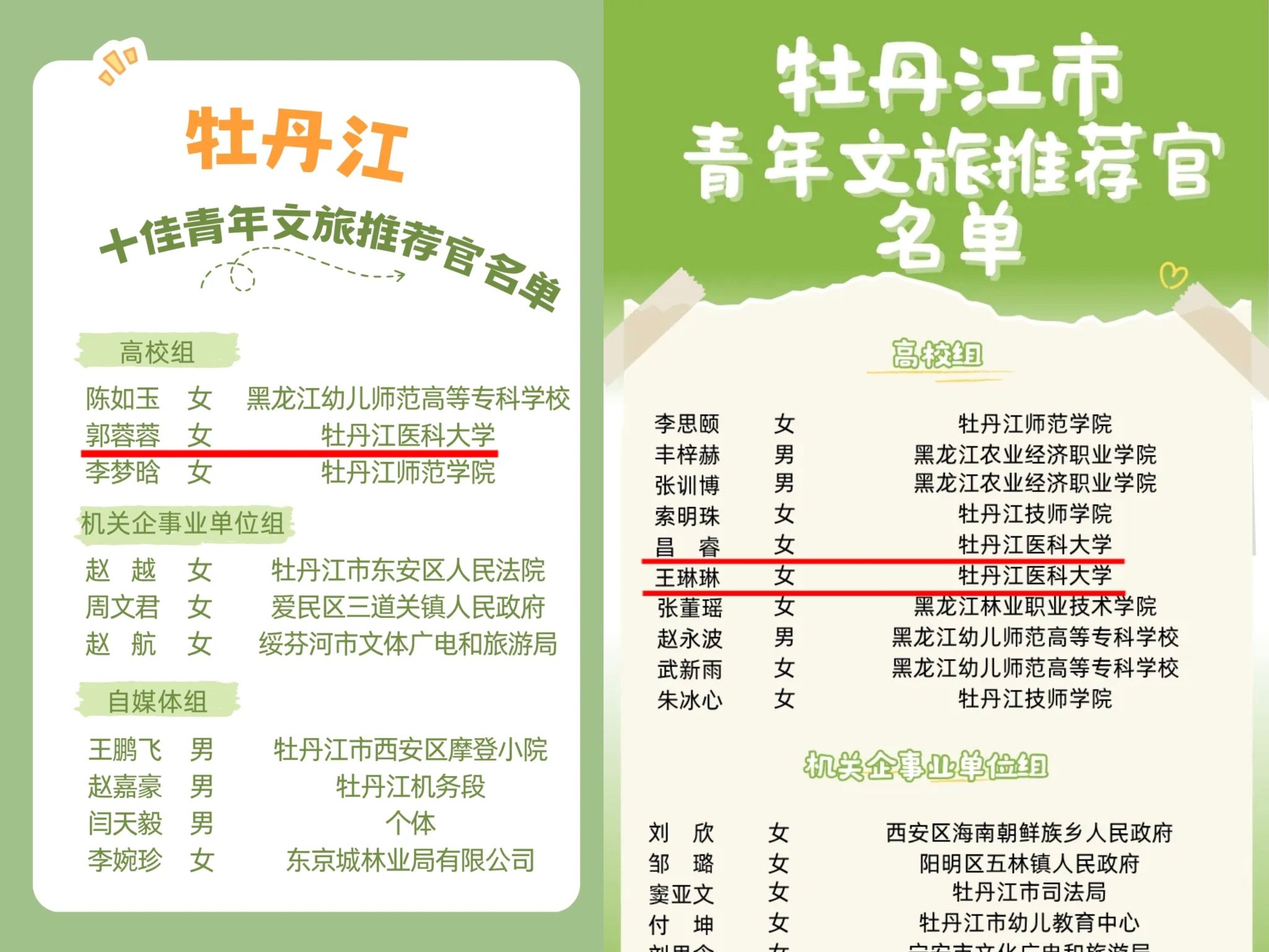 近日,由牡丹江市文体广电和旅游局、共青团牡丹江市委联合主办的牡丹江市青年文旅推荐官选拔赛圆满落幕。在这场展现青春风采与文旅魅力的赛事中,我校学子凭借出色的表现脱颖而出,三名参赛学生均被评为青年文旅推荐官,其中一名学生荣获“十佳青年文旅推荐官”称号。