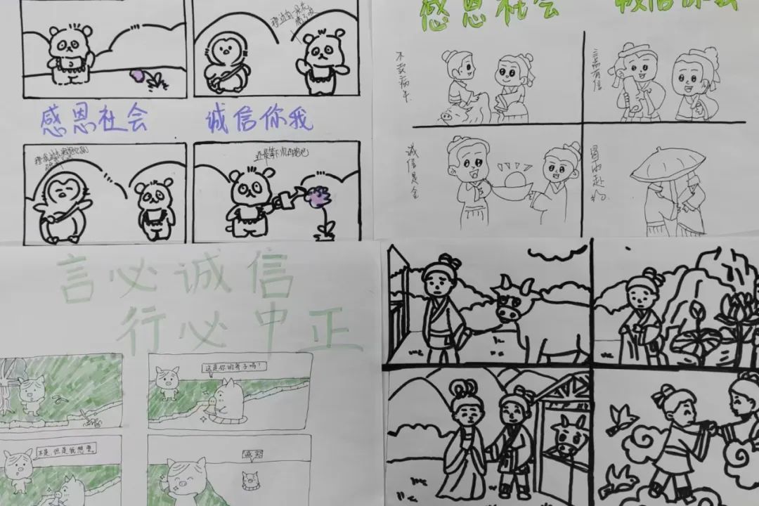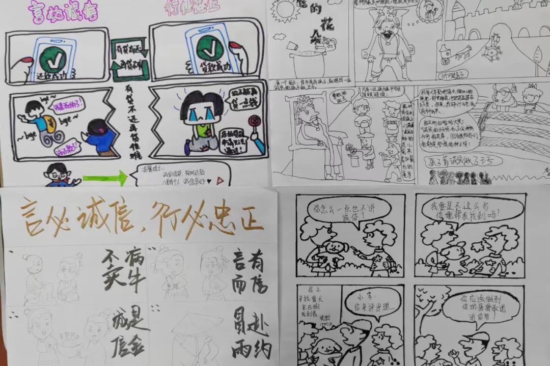 活动伊始,由各班班长或团支书下发关于此次活动的通知,并积极鼓励本班同学报名参加,做好前期动员工作。其次,同学们通过自己对诚信的理解和一些诚信小故事来创作漫画或者连环画,并将自己对诚信的深刻理解和感受融入到漫画中去。最后,在了解完活动要求后,各位参赛者搜集有关诚信的小故事,并了解“言必诚信,行必忠正”这八个字的含义,与漫画加以结合,认真创作出漫画。创作漫画丰富了学生们的的想象力、创造力。学生们在充分展示自己绘画技能的同时,更好地传播守信正能量,争当“言必诚信,行必忠正”的传承者、践行者、传播者,不断提高自身的行为习惯、个性品质和思想道德素质。