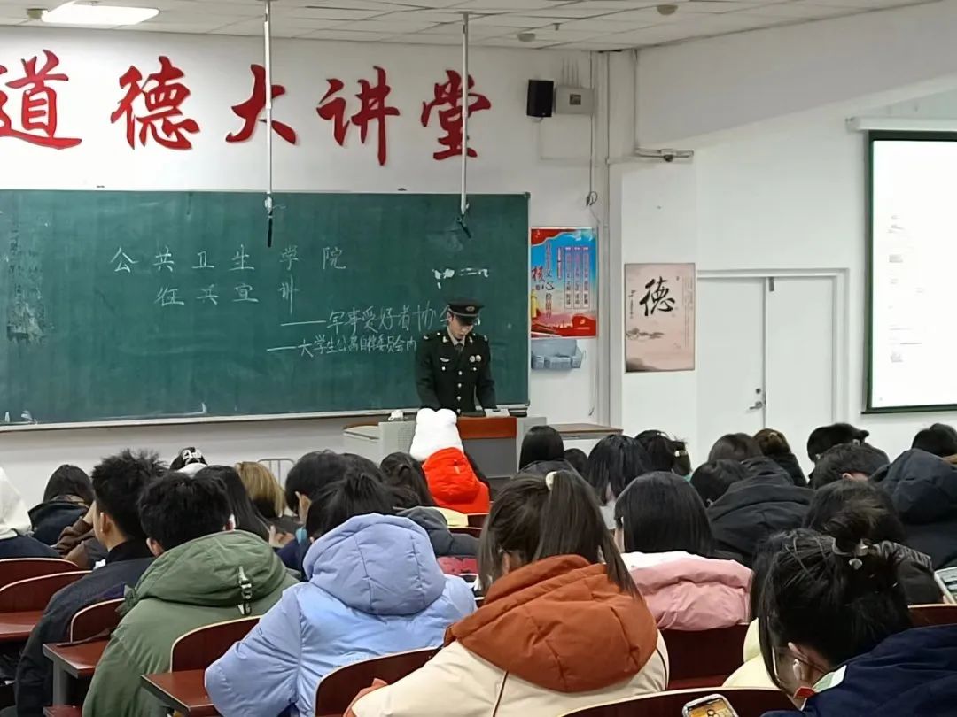 为深入学习习近平强军思想,引导学生树立家国责任感,明确身为新时代青年所肩负的重任,鼓励学生积极参军入伍。公共卫生学院于2023年11月30日在科技楼阶梯一教室开展2024年春季征兵宣讲会。本次宣讲由学院宣传联络部主持召开,2023级全体新生参加。