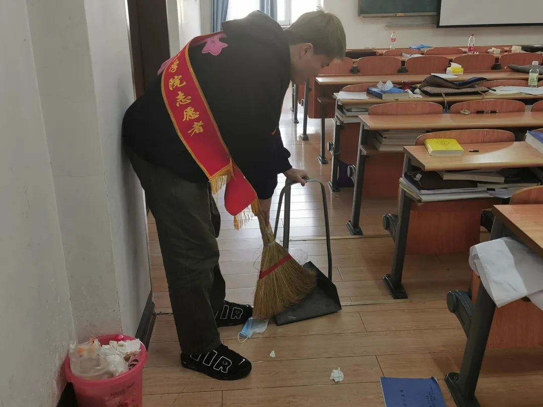 党员们认真清扫着每一个角落及书桌上残留的字迹,团结合作,互帮互助,充分将志愿服务精神付诸于实践,成为校园里一道美丽的风景线。党员们不仅为同学们创造了整洁舒适的学习环境,更在过程中体会了志愿服务的快乐,培养了吃苦耐劳的精神,学会了团队的合作意识,为我院构建美好校园贡献了一份力。