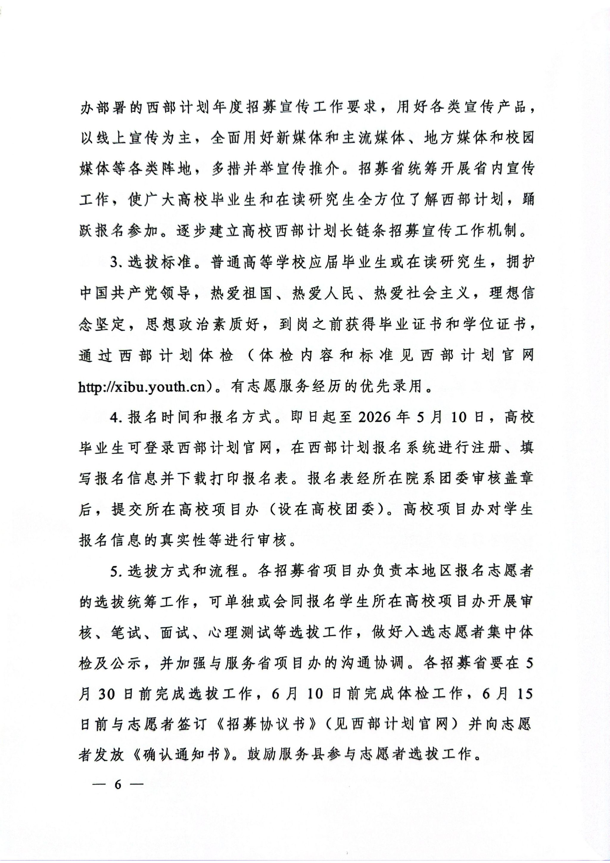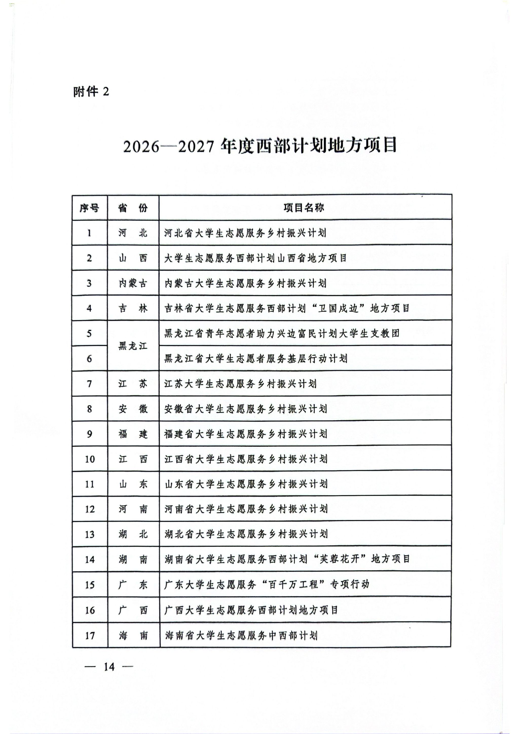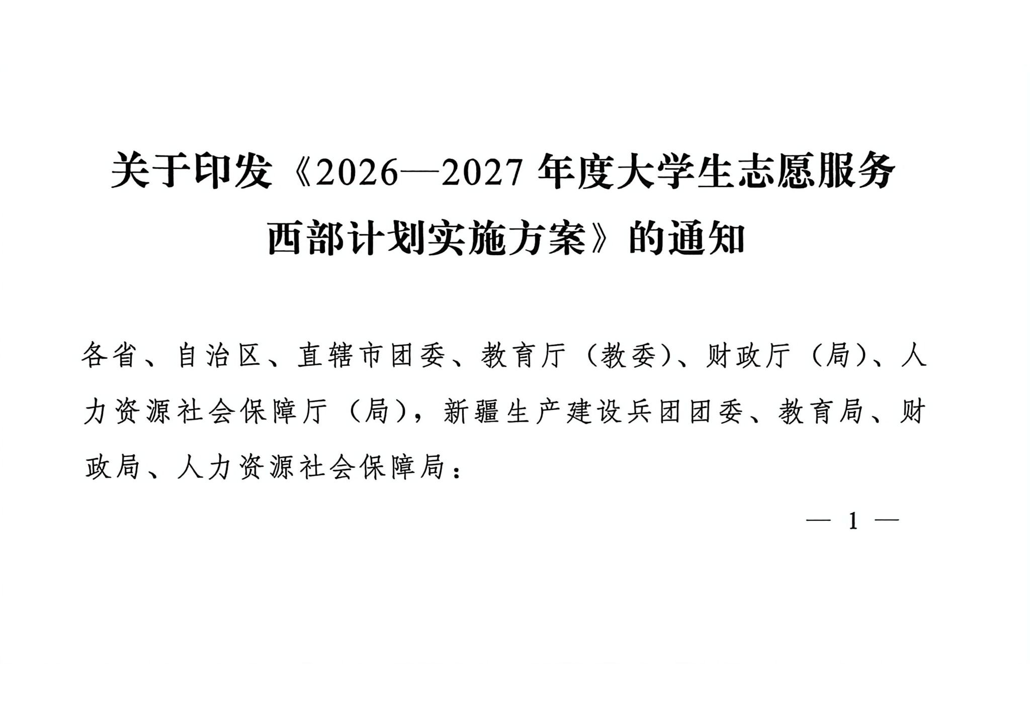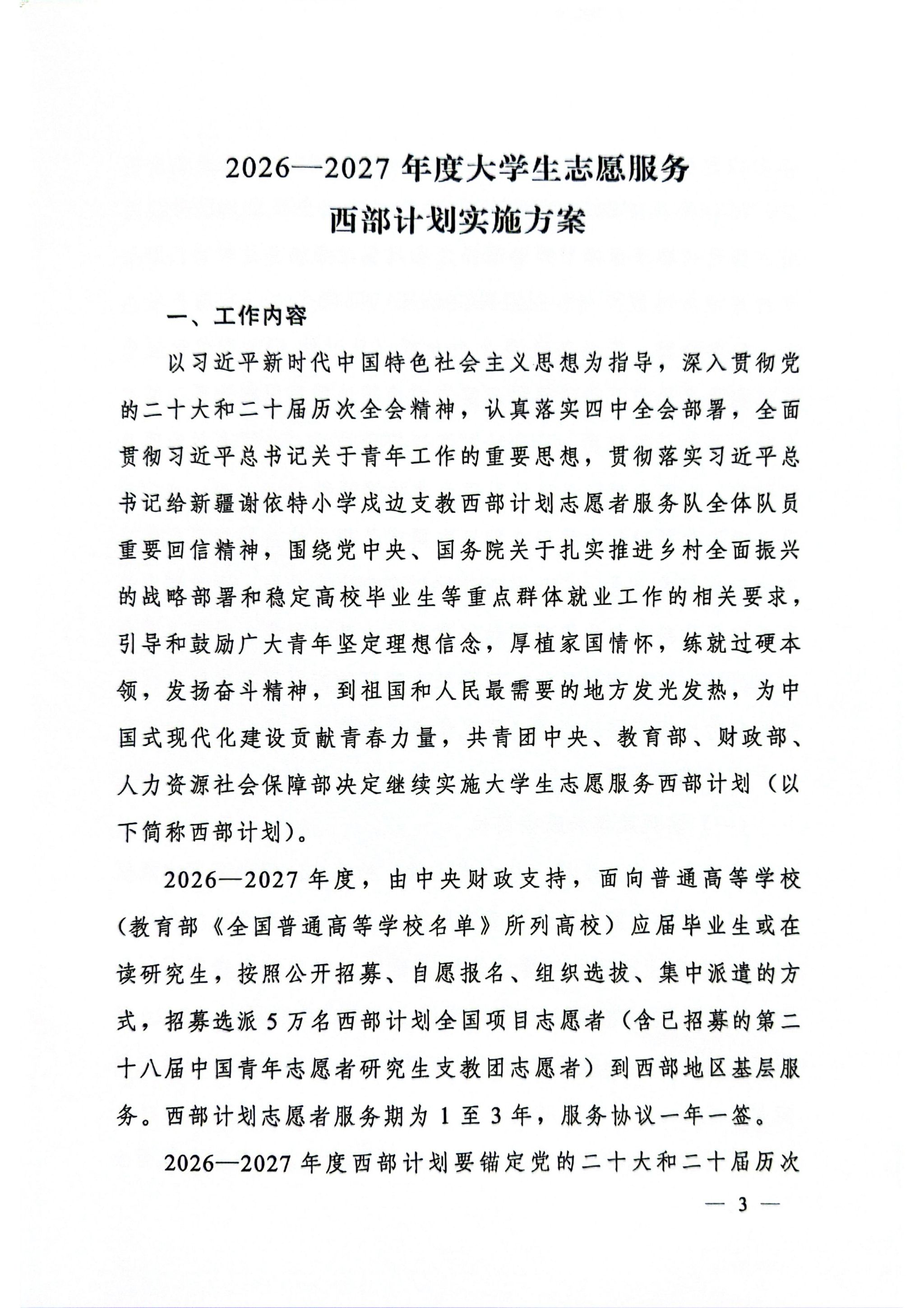 关于印发《2026—2027年度大学生志愿服务西部计划实施方案》的通知