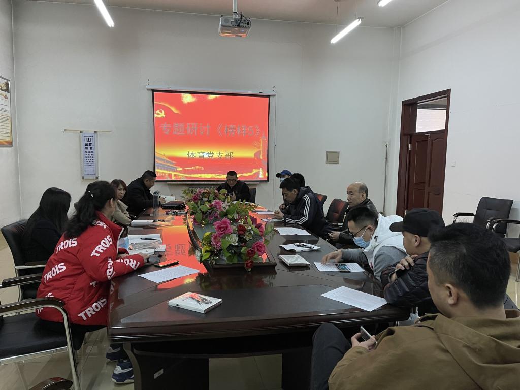 2021年3月24日,体育党支部组织全体党员集体观看优秀共产党员专题节目《榜样5》。节目通过事迹再现、嘉宾现场访谈、重温入党誓词等形式讲述了在2020疫情防控中,张西京、张宏、杜云、达娃仓决、汪勇5位先进个人的事迹,以及火神山雷神山医院施工单位党组织、浙江省援武汉抗疫前方指挥部临时党委两组先进基层党组织。他们的事迹行动集中彰显了优秀共产党员坚定信仰、无私奉献的精神风貌和中国人民团结一心的信念。