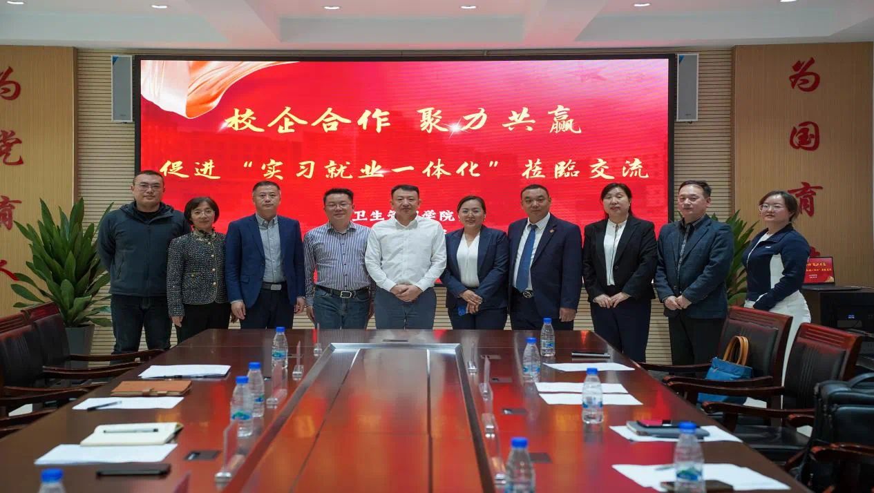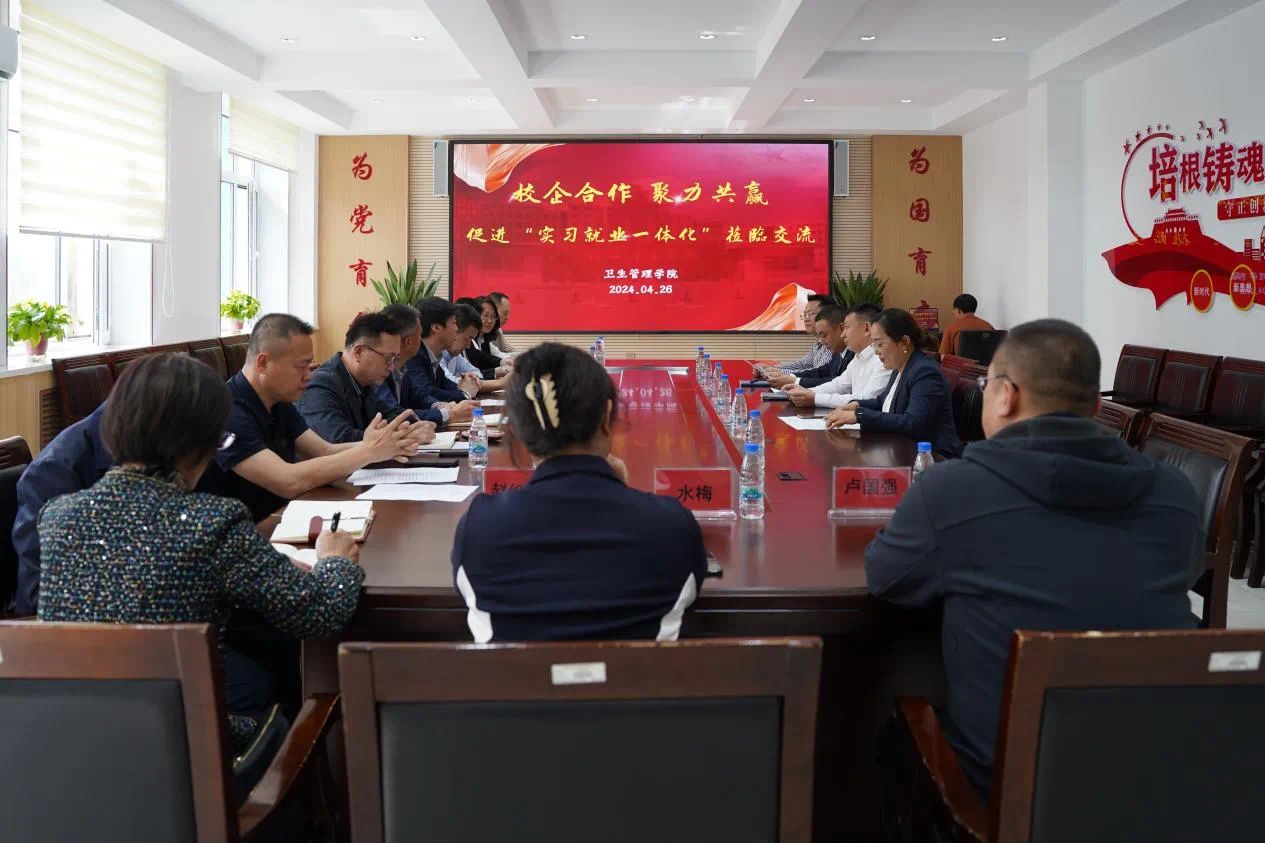 卫生管理学院院长师东菊介绍了学院情况、针对学科专业特色、大学生双创教育、学科竞赛、“1+X”证书试点工作、大健康产业学院建设、实习就业等情况等做了详细介绍,为双方推进“实习就业一体化”达成共识。