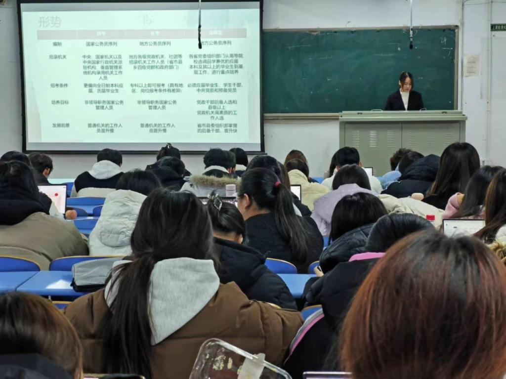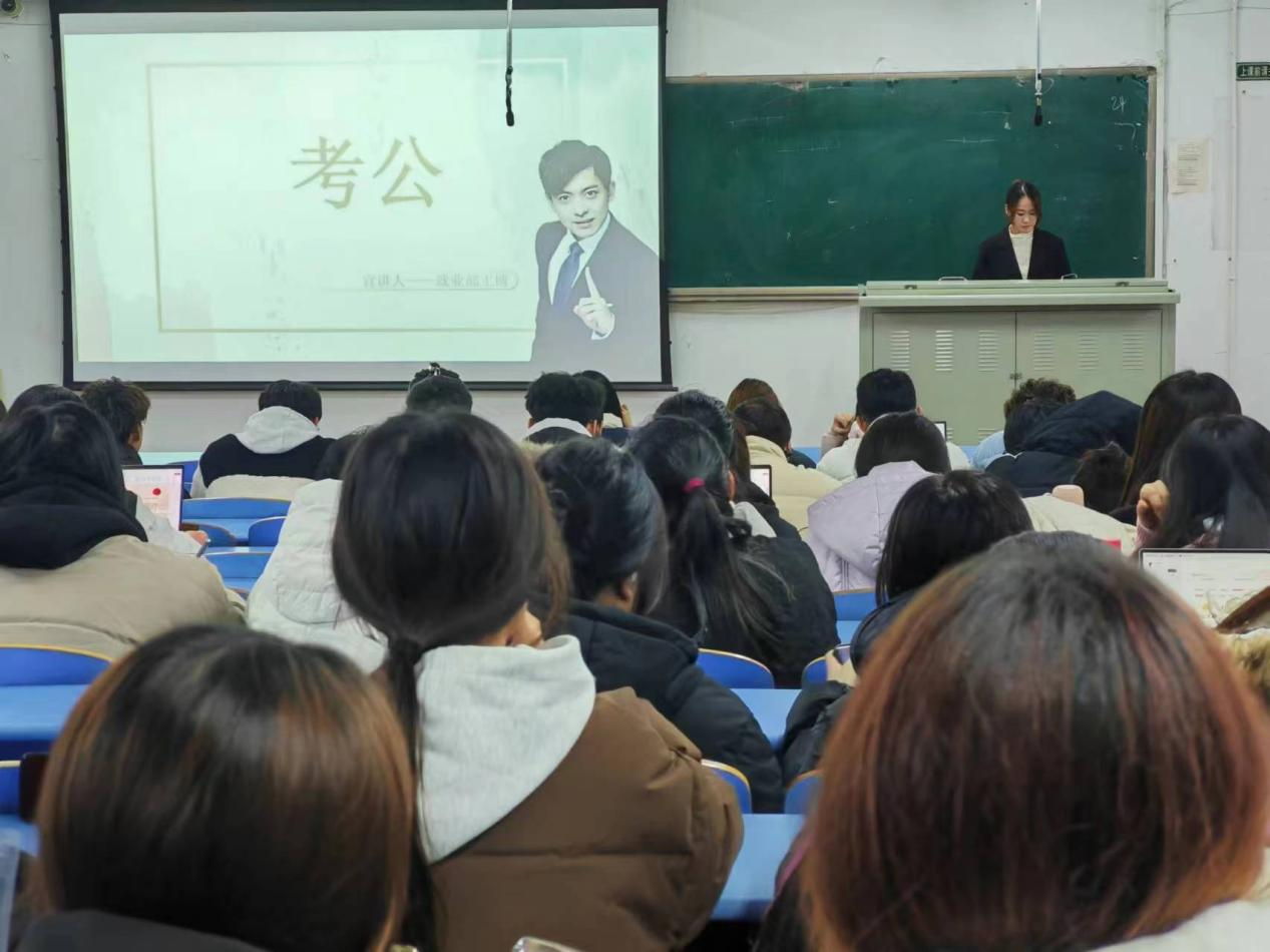 活动伊始,王博同学首先介绍了关于公务员考试的报考流程、考试内容、备考策略等。此外,还为同学们解答备考中遇到的问题,并提供个性化的备考建议。考公是指参加公务员考试,通过考试成为公务员。公务员是指在政府机关、事业单位等公共部门工作的人员,具有稳定的职业、较高的社会地位和相对较好的福利待遇。活动期间,王博同学说明考公可以获得稳定的职业,具有相对较高的职业安全性和稳定性,不易受到市场经济波动的影响。公务员在工作中能够接触到各种各样的工作内容和领域,有机会不断学习和提升自己的能力,为个人的职业发展提供了一定的空间和机会。活动最后,王博同学呼吁大家正确认识公务员考试,考公也需要付出一定的努力和时间,需要考生在备考过程中认真准备,提高自己的综合素质和能力。