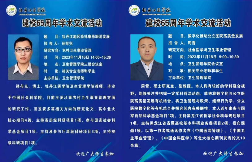 为庆祝牡丹江医学院建校65周年,营造浓厚的学术氛围,搭建学术交流的平台,从而促进科研水平提升及学科专业的建设,推进学院高质量内涵式的发展。卫生管理学院于2023年11月16—18日开展了学术交流系列讲座,讲座由副院长郭继民主持,由公共事业管理教研室教师孙布克博士、周雪副教授主讲,所有无课教师及有科研兴趣学生参加了此次系列讲座。
