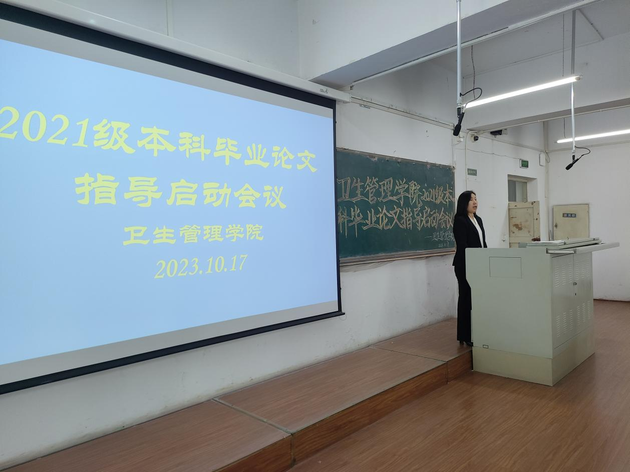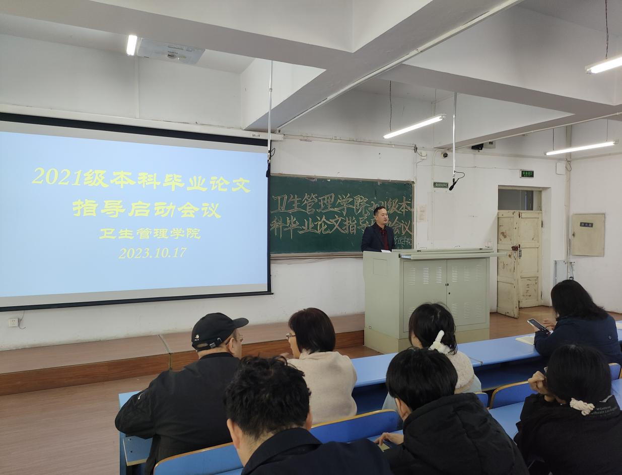 为加强学科及专业建设,提升人才培养质量,确保2021级毕业生论文工作的高质量开展,加强学生毕业论文的规范性,保证毕业论文撰写的质量,推进本科生毕业论文管理工作的科学化、规范化,提高本科生毕业论文水平和人才培养质量。2023年10月17日,卫生管理学院在教学楼召开了2021级本科生毕业论文工作启动会,2021级毕业论文指导教师及2021级学生参加了此次会议,会议由郭继民副院长主持。
