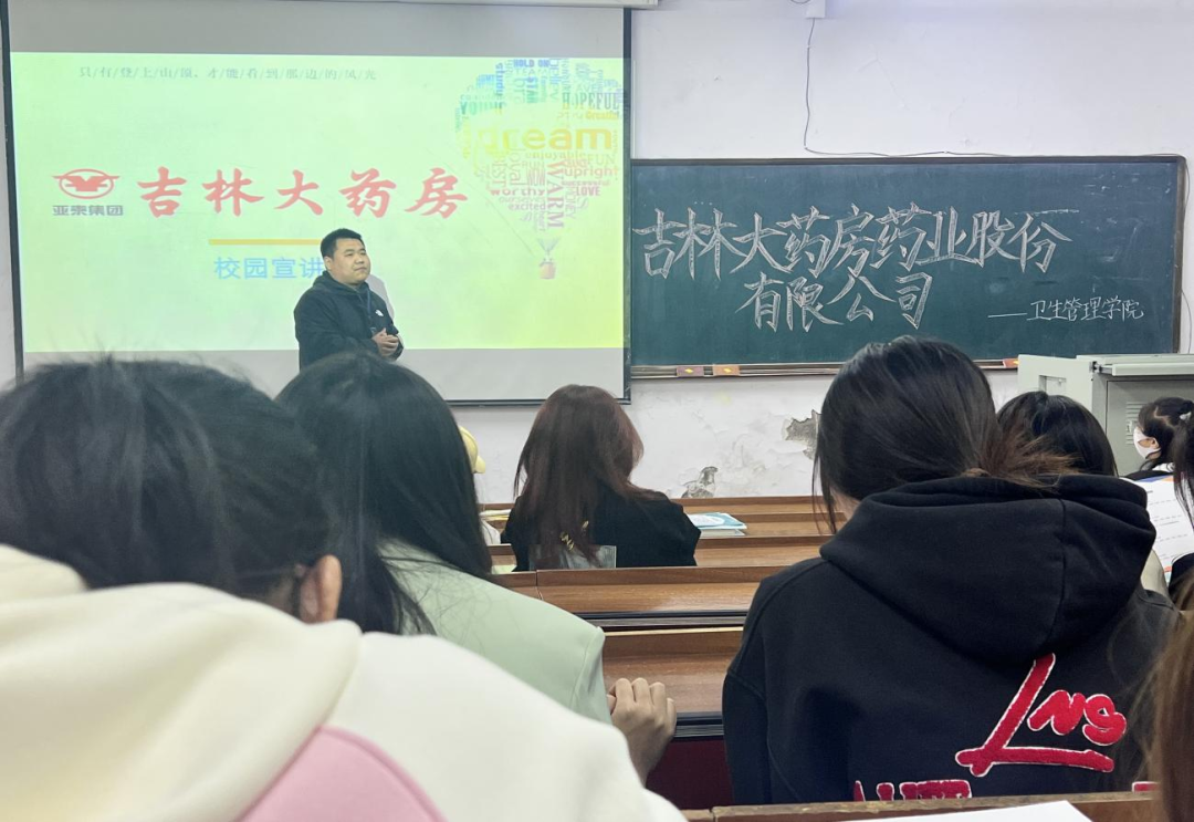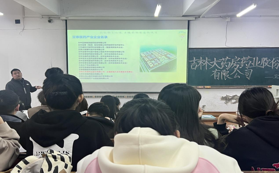 活动伊始,刘磊老师对吉林大药房药业股份有限公司的到来表示热烈的欢迎,要求同学们对职业生涯要有长远的规划和有针对性的准备,对社会就业方面的具体情况有切身体会。随后,吉林大药房药业股份有限公司田刚对公司简介、文化理念、晋升渠道、员工福利等进行了详细的介绍,让同学们对该公司的运营服务有一定了解。最后,田刚希望同学们能够在吉林大药房药业股份有限公司充分锻炼自我得到成长。