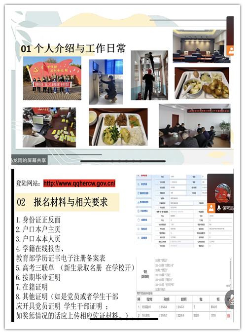 会议伊始,马龙雨从工作情况介绍、报名材料准备与报考相关要求等三个方面与大家进行分享,首先,马龙雨分享了自己入职一年来的感受,对自己入职“名校优生”后政策待遇进行了详细介绍,同时将自己报名、面试等选聘环节的经验毫无保留地分享给学弟学妹们。他认为“名校优生”是一个很好的就业选择,希望学弟学妹们可以把握机会,做好充分准备。随后,马龙雨为大家解读了《齐齐哈尔市2023年“名校优生”选聘公告》相关要求,详细介绍了名校优生:岗位计划、报名条件、选聘程序和政策待遇,马龙雨还对同学们在岗位选择上进行了有针对性的指导。最后,马龙雨针对同学们提出的问题进行了解答,希望所有同学可以明确自己的就业方向,充分把握政府给予的利好政策,实现高质量就业。