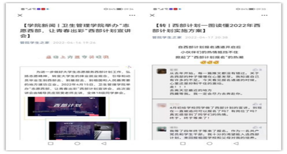 卫生管理学院一直以来认真贯彻落实党中央、国务院关于高校毕业生就业工作的决策部署,鼓励毕业生留省就业,到基层就业,特别是在“龙江全面振兴、全方位振兴”的关键时期,学院引导毕业生“汇聚龙江、服务龙江、扎根龙江、奉献龙江”。一、开展留省就业政策宣传,以政策留人:为鼓励毕业生留省就业,学院开展以留省就业为主题的就业主题教育、地方政策宣讲、就业直播待岗、就业创业典型经验分享会等就业活动。充分利用新媒体平台制作并发布多期关于“西部计划、三支一扶、雪城优才和名校优生”等就业政策的宣传推文,为毕业生详细讲解留省就业相关政策待遇。帮助毕业生了解黑龙江省人才政策,为毕业生留省就业牵线搭桥,做好服务。二、发挥留省就业榜样作用,鼓励毕业生留省就业:学院积极开展“扎根龙江 服务基层 就业先锋”宣传活动。活动由2022届留省工作的毕业生分享个人亲身经历、就业经验、求职感悟等,截至目前在“管院学生之家”微信公众号平台已开展了四期宣传活动。通过宣传留省就业学生的先进事迹,鼓舞了同学们的就业信心,营造了建设龙江的浓厚氛围,为龙江留住人才、促进2022届毕业生尽快就业的同时也激励着学弟学妹们一同担当起新时代龙江青年的责任,发挥了榜样示范引领作用。