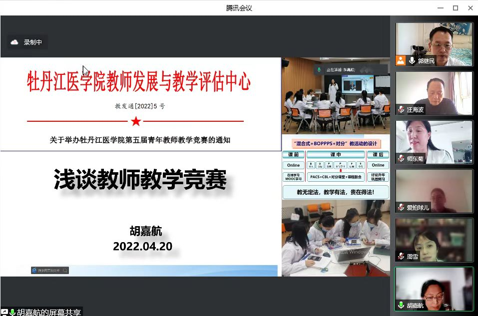 疫情防控严落实,确保线上教学质量“不下降”。为加强学院青年教师队伍建设,鼓励青年教师提升教学能力和业务水平,为青年教师成长搭建平台,学院于2022年4月20日采用腾讯会议以线上方式举行了青年教师在线教学竞赛。本次大赛邀请黑龙江省首届教学创新大赛一等奖获得者,医学院影像学院胡嘉航副教授担任评委,并于赛后进行了教学竞赛课程设计培训。