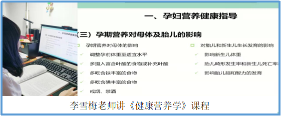 李雪梅老师在《健康营养学》授课过程中,常常可以结合生活中的营养膳食为例,而此次线上教学期间,正值疫情突然出现,学生们变成了亲历者和参与者,与学生共同讨论封校管理期间,我们怎样更好的搭配自己的饮食,做到学以致用,营养膳食,并不时穿插着抗“疫”心理建设。既照顾了学生的饮食状态,又照顾到学生心理状态,又将课程思政巧妙地融入教学实践中,收到了一定的效果。
