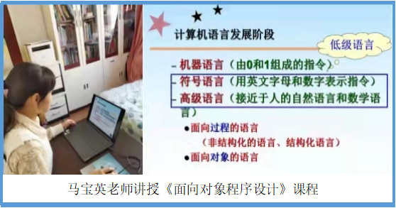 马宝英老师在《面向对象程序设计》课程讲授中,介绍我国在程序开发方面的成就及现状,通过追溯历史并列举“两弹一星”元勋邓稼先等科学家的相关事迹,激发学生的爱国情怀,在疫情期间作为大学生更要有奉献精神及责任心,为抗议胜利贡献力量。