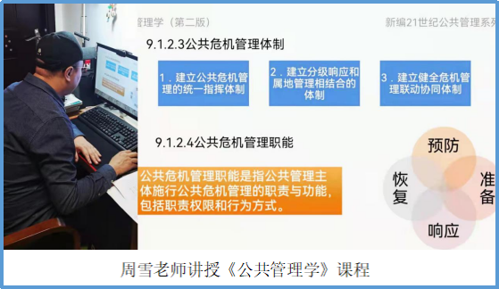 周雪老师在《公共管理学》课程的教学中,在讲授公共危机管理时,以新冠疫情下,学校封校的管理措施引出公共危机管理的基本原则,并询问同学们在校上网课期间如何思考进行有效的自我管理,鼓励同学们以积极的心态,良好的状态投入到学习生活中,起到了较好的教学效果。