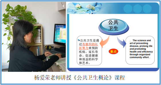 杨爱荣讲授《公共卫生概论》课程,注重培养学生的自主学习的能力,拓宽学生的知识面,多以思维导图、图片、图表等直观方式呈现,以适应特殊时期学生的学习特点。同时,增加互动环节,紧贴当前新冠疫情,在授课中着重介绍疾病预防控制过程中的科学方法和医务工作者及各领域相关工作人员的精神品质,激励学生奋发向上,培养学生的社会责任感和职业操守。