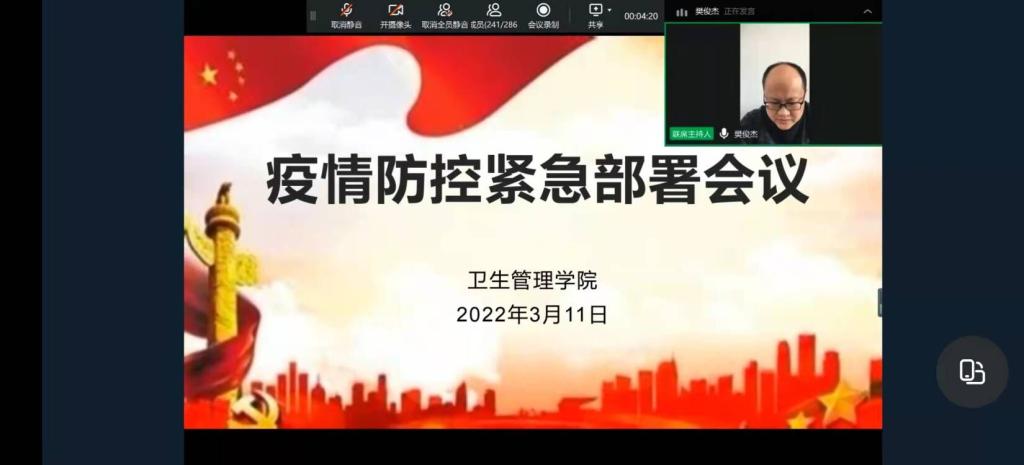 为切实做好当前严峻疫情形势下的防控工作,对疫情防控工作进行再强化、再部署、再落实,统筹做好疫情防控和学校发展各项工作。2022年3月11日,卫生管理学院于线上召开“疫情防控紧急部署”会议。本次会议由副处级辅导员樊俊杰老师组织召开,20级全体同学参加。