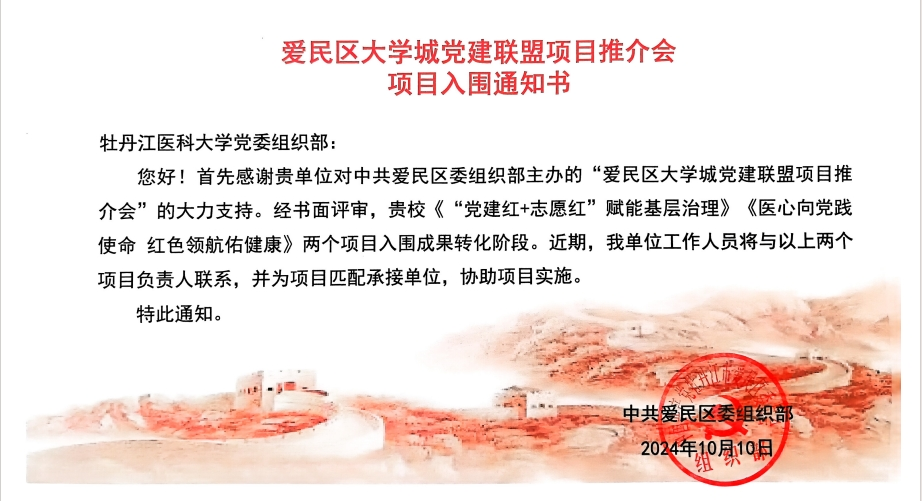 近期,由牡丹江市爱民区委组织部举办的大学城党建联盟项目推介会如期结束,经基层党委申报、学校审核推荐、联盟项目评审专家书面评审,学校医学影像学院党委和卫生管理学院党委分别申报的《医心向党践使命 红色领航佑健康》和《“党建红+志愿红”赋能基层治理》2个项目成功入围成果转化阶段。