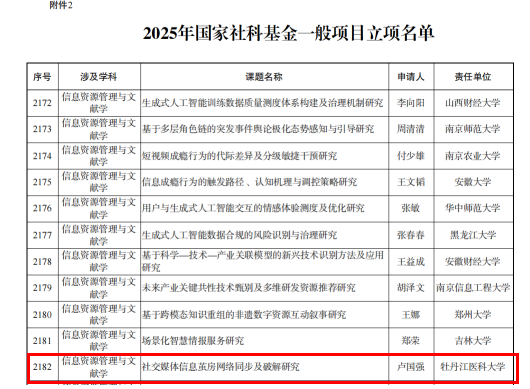 近日,全国哲学社会科学工作办公室正式公布了2025年国家社会科学基金年度项目立项名单,我院卢国强副院长带领的信息资源管理科研团队主持的课题《社交媒体信息茧房网络同步及破解研究》成功获批2025年度国家社会科学基金项目立项,实现了学校国家社会科学基金项目新突破。