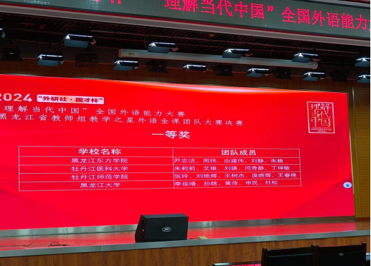 2024黑龙江省外语金课团队大赛决赛于2024年11月1日在哈尔滨落下帷幕。我校外语教研部朱莉莉、艾琳、刘瑛、闫秀静、丁坤敏团队荣获一等奖。