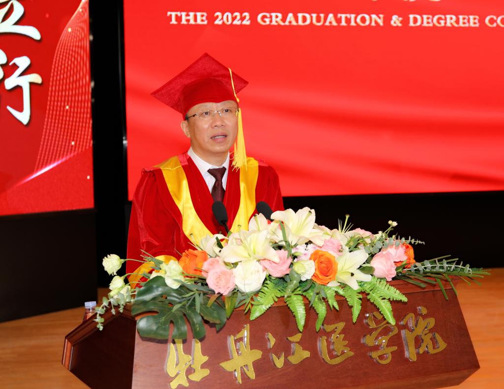 他勉励毕业生们,要做一个有信念的人,与祖国同步,与学校同行,在时代大潮中找寻生命的意义;要做一个有道德的人,先立德,再行事,内心坦荡,前路宽广;要做一个有情怀的人,坚定强国志,厚植爱国情,履践报国行,彰显扶危济难的高尚情怀,用真情助健康之完美,用大爱托起生命崇高;要做一个有行动的人,用行动筑就理想之基,让人生不留遗憾;要做一个自信的人,用清醒的自我认知和笃定的心理状态行稳致远,与母校共同用行动诠释信念、坚守、担当、奉献。最后他强调,时代召唤,使命在肩,大道至简,敢为人先!希望并相信同学们,在新的航程上,一定会锚定方向,乘风而起,劈波斩浪!
