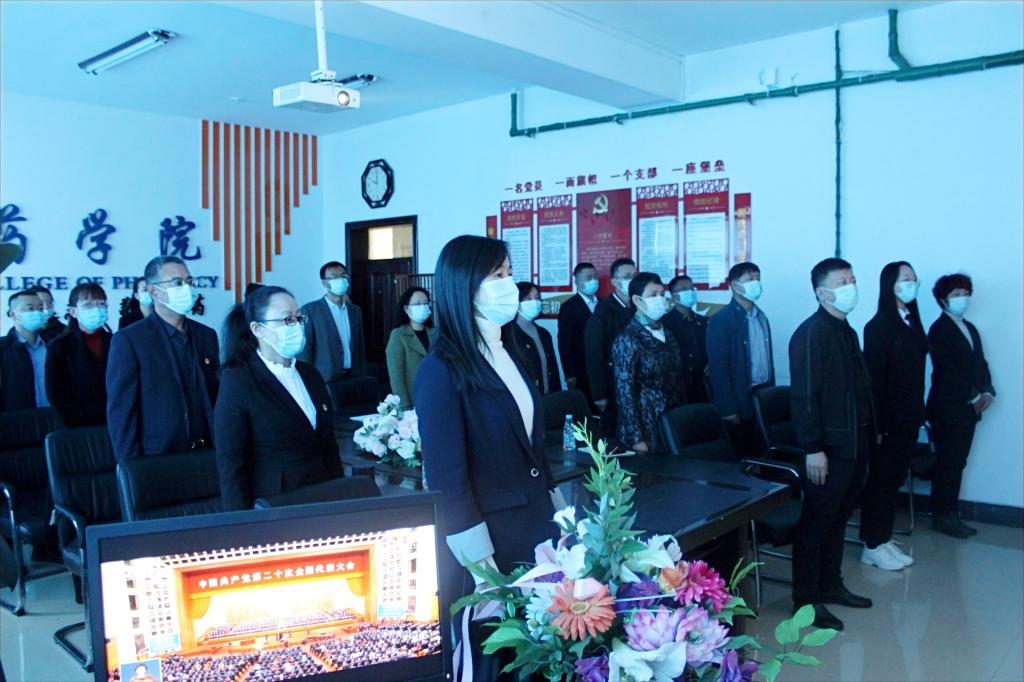 药学院班子成员、各科室负责人、全体教师党员在药学楼420集中观看直播。