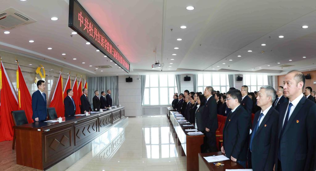 接续奋斗绘蓝图,继往开来谱新篇。2024年4月12日9时,伴随着雄壮激昂的国歌声,中国共产党牡丹江医学院第三届委员会第六次全体会议在临床技能实训中心17楼大会议室隆重召开。学校领导班子成员,党代表,学校党委委员、纪委委员,全校处级领导干部参加会议。