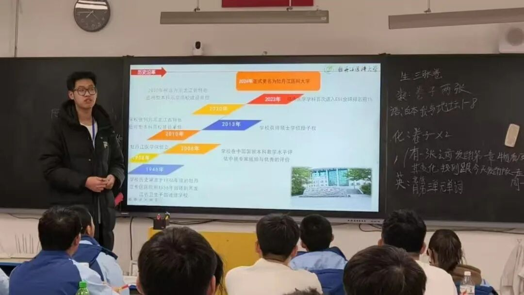 近日,我校麻醉学专业吕铭元同学回到了庆安三中 ,拉开了我校优秀学子母校行系列活动的帷幕。 宣讲中,他重点分享了牡丹江医科大学的发展历程、教学体系、实验设施、实习基地等内容。尤其是,学校志愿服务队和医学科普社团让专业知识真正“活”起来,春季运动会的接力赛和秋季迎新晚会的活动,则让紧绷的学业生活多了几分松弛与热爱。他结合自己从庆安三中到牡医大的备考经历,特别叮嘱学弟学妹珍惜时光,踏实走好备考的每一步。