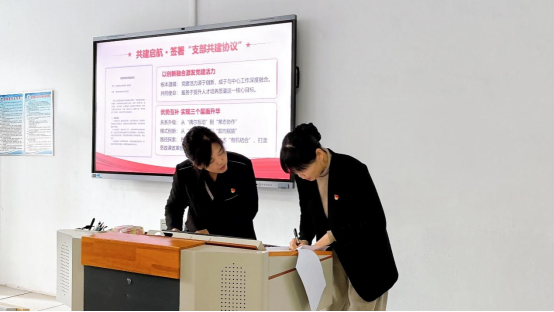 活动伊始,在双方支部党员的共同见证下,现代教育技术中心党支部书记王芳与马克思主义学院第一党支部书记许晓晴共同签署了《结对共建协议》。协议明确,双方将秉持“资源共享、优势互补”的原则,通过组织建设互促、党员队伍互动、优势资源互享等常态化机制,将现代教育技术中心的技术服务优势与马克思主义学院的理论育人优势深度结合,实现从“单向支持”到“双向赋能”的转变,聚力服务学校立德树人的根本任务,达成“1+1>2”的聚合效应。