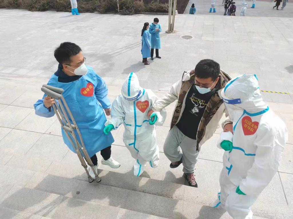 “星火”党员志愿服务队面对突如其来的疫情,积极面对当前疫情防控的严峻形势和挑战,为保障我院学生的健康和安全,在第一时间架起通往核酸检测点的“红桥”,拦截过往车辆保护学生安全,指挥学生有序通过,当夜晚来临一抹红色又出现在寝室楼里最脏最乱的地方将一个个垃圾,一处处角落收拾干净,发挥了我们学工党支部“星火”志愿服务队的战斗堡垒作用,党员同心、共同战疫,让党旗在抗疫一线高高飘扬,用担当和使命为同学们筑起了一道坚固防线。