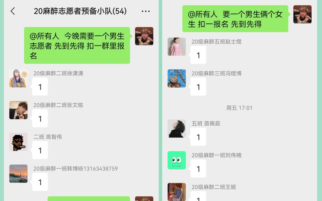 20级麻醉志愿者预备队也是萤火虫志愿者服务队的预备队,当接到清理校园、寝室的任务后,面对庞大的工作量,辅导员在20级志愿者预备队群中发起公告,“紧急招募志愿者”“我来做志愿者!”“我也来。”“我们寝室的也能一起带来一起做志愿者吗?”“什么时候需要到岗?”“需要多少人,够吗?”“还有什么能做的,尽管说。”“求求大家了,这次给我个机会”……一条条微信接连不断蹦出,参与疫情防控、美化校园等等,一有任务,群里直接推送认领,用实际行动印证了强国有我。
