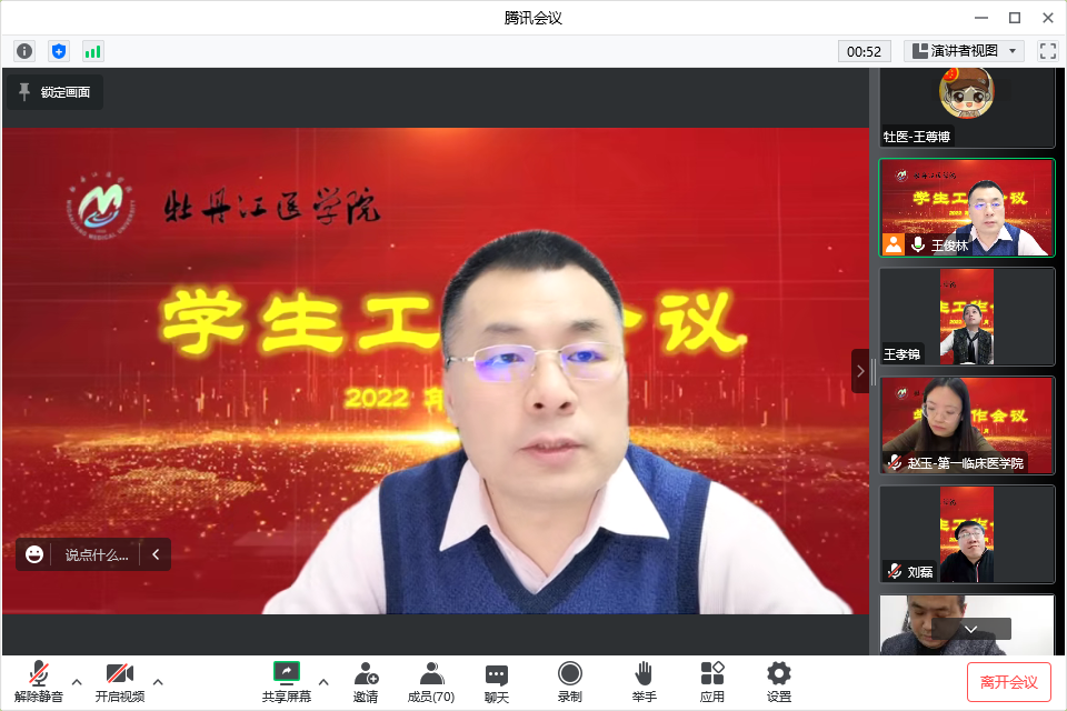 王俊林通报了学校近期疫情防控及舆情处置相关工作情况,传达了黑龙江省第24次全省高校疫情防控视频调度会议精神和工作要求,并对本年度学生工作进行了回顾,充分肯定了学工队伍在学校疫情防控、校园安全稳定、学生教育管理等方面发挥的突出作用,同时就年末的重点工作进行部署。