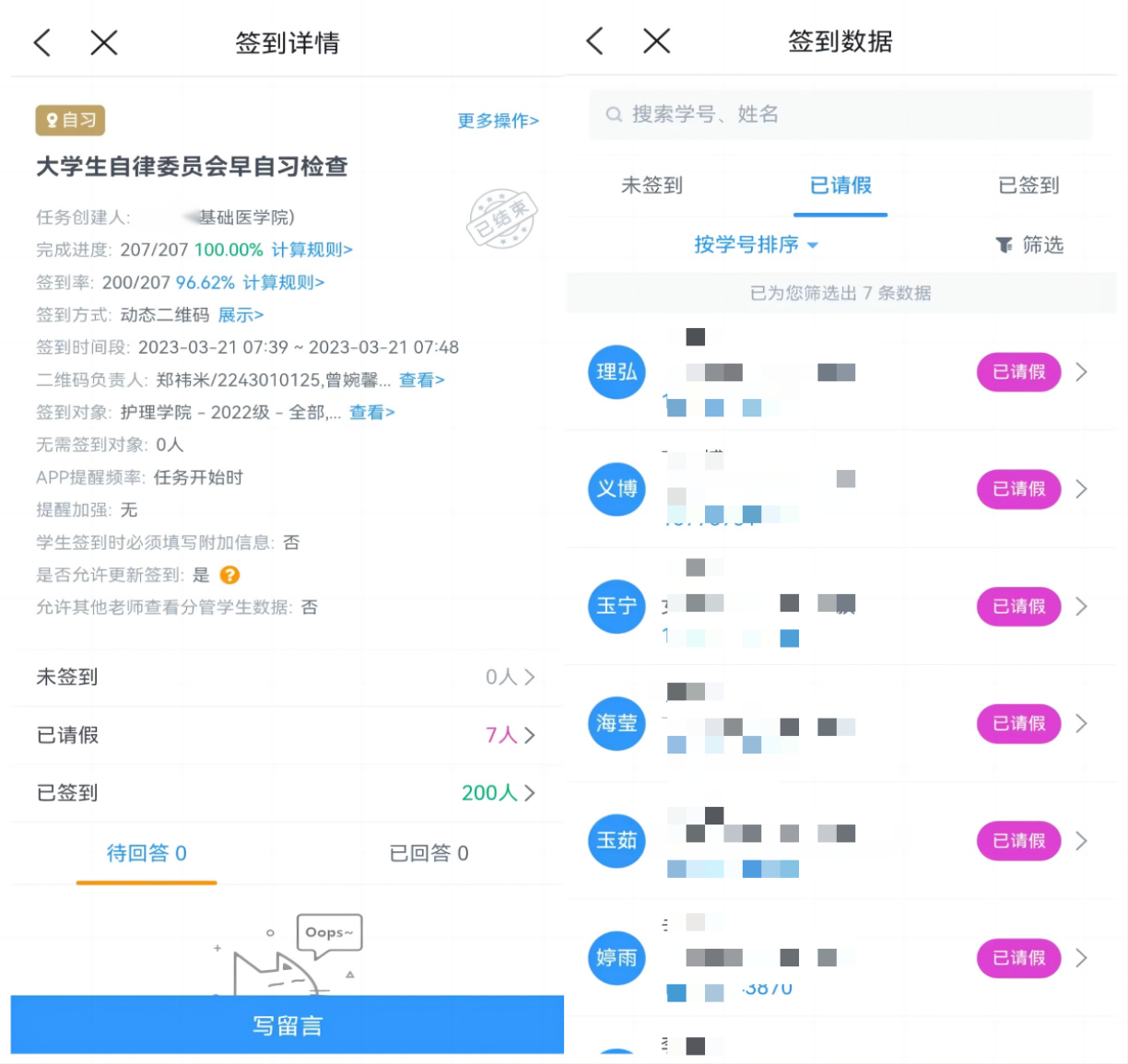 学生每天通过使用“今日校园”APP,进行定位签到、动态签到,开启防作弊功能,辅导员对学生请假及出席情况,一目了然,并能第一时间了解缺勤学生的位置和动向,切实提高了学生到课率和课堂效果,有效避免了学生突发事件的发生。