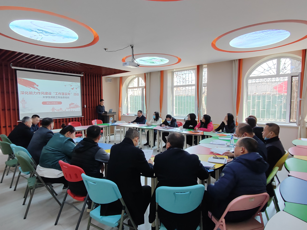 为贯彻落实党的二十大精神,扎实开展深化能力作风建设“工作落实年”活动。深入贯彻落实党和国家的各项资助政策,加强学校资助队伍建设,提升资助工作人员业务水平,稳步推进学生资助工作有序科学发展。2023年3月28日上午,学生工作部(处)组织开展深化能力作风建设“工作落实年”活动——大学生资助工作业务培训。学生工作部(处)部长王俊林、副部长关会林、学生资助管理中心副主任孙天超、各学院学生工作负责人、学工办主任(负责人)以及辅导员代表参加此次活动。
