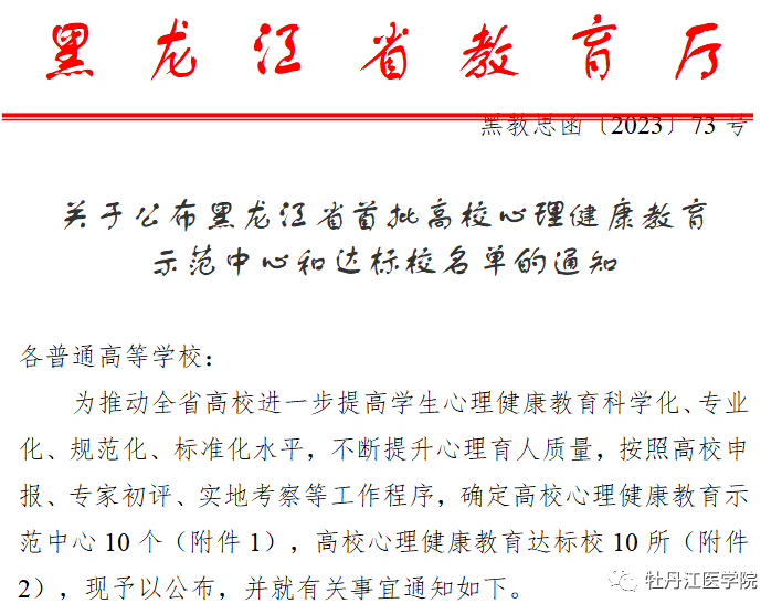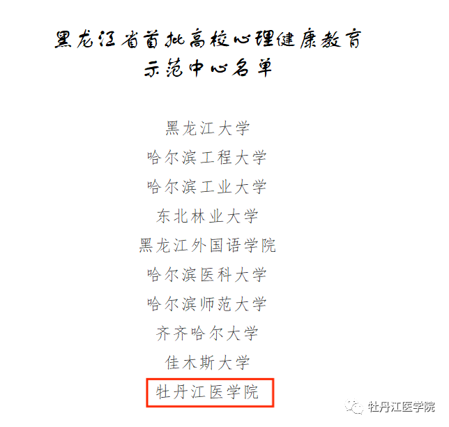 近日,黑龙江省教育厅发布《关于公布黑龙江省首批高校心理健康教育示范中心和达标校名单的通知》,经学校申报、省内外专家线上初评、线下实地考查、省教育厅综合评定,共遴选黑龙江省高校心理健康教育示范中心10所,心理健康教育达标校10所。我校成功获批“黑龙江省首批高校心理健康教育示范中心”荣誉称号。