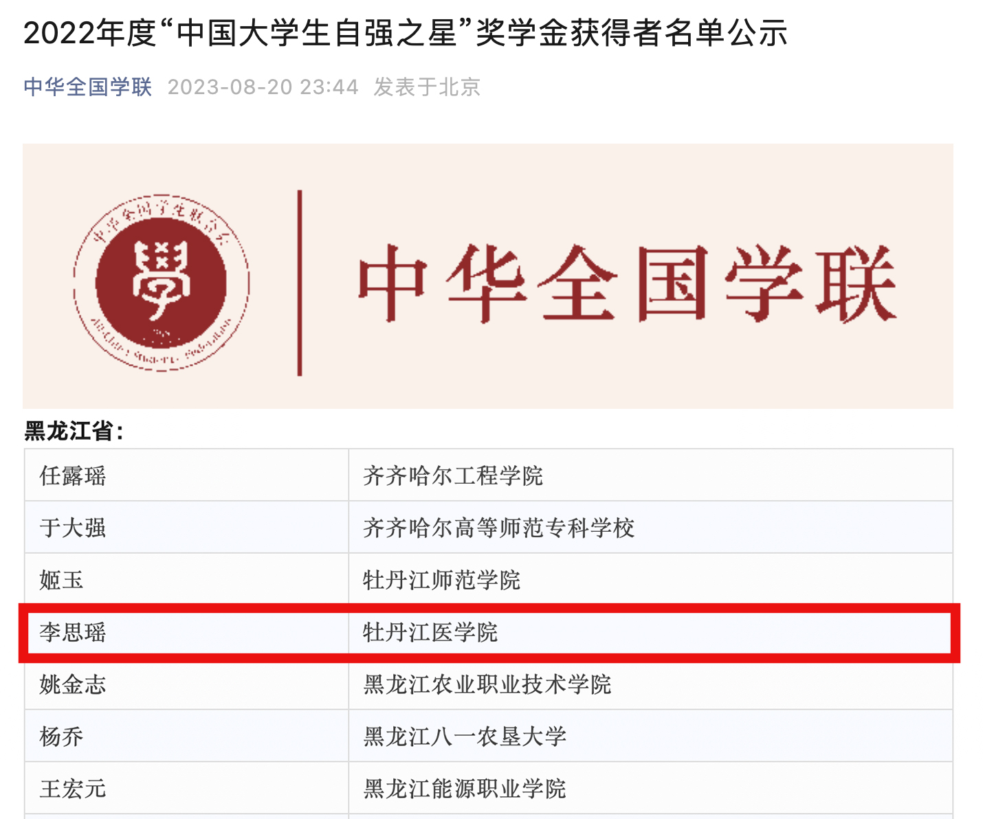 近日,由共青团中央、全国学联指导,中国青年报社、新东方教育科技集团、中国青年创业就业基金会联合举办的2022年度“中国大学生自强之星”奖学金获得者名单揭晓,经学校推荐、省级初评、全国评审,我校卫生管理学院李思瑶同学荣获这项国家级荣誉。