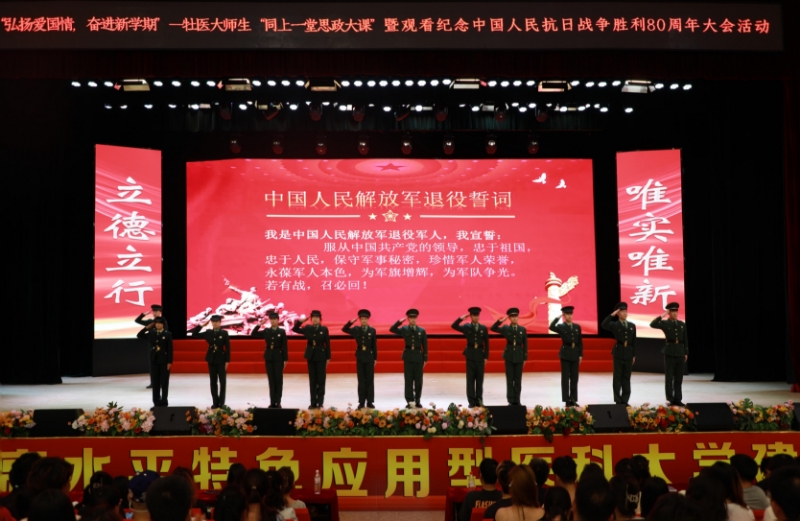 直播结束后,退役大学生士兵代表进行了集体宣誓,他们用铿锵有力的声线表达着对祖国的忠诚和为人民服务的决心,这种浓郁的家国情怀也深深感染着在场的每一位师生。至此,“弘扬爱国情,奋进新学期”——牡医大师生“同上一堂思政大课”暨观看纪念中国人民抗日战争暨世界反法西斯战争胜利 80 周年大会活动圆满结束。