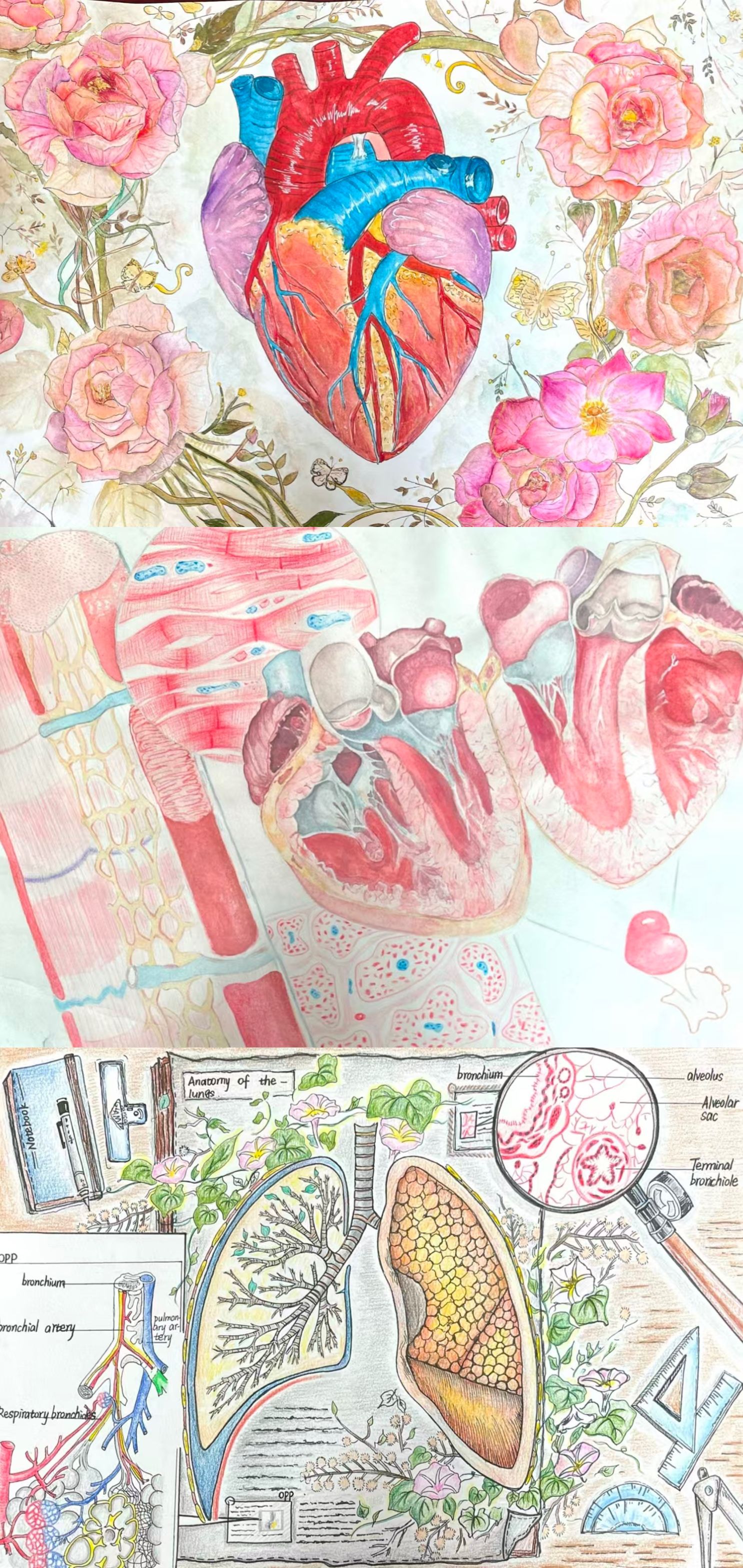 在近一个月的创作期内,同学们热情投入,潜心创作。他们或参照解剖图谱细致勾勒,或走进实验室对照标本写生,在方寸画纸间,以笔墨色彩精微呈现骨骼、肌肉、器官的形态与关联,将严谨的医学知识转化为具有感染力的视觉图像;本次大赛共收到来自全校各专业学生的百余幅投稿。最终评选出一等奖10人、二等奖20人、三等奖30人、优秀奖40人。
