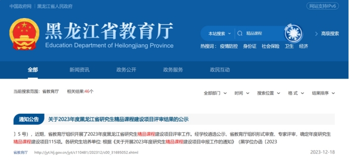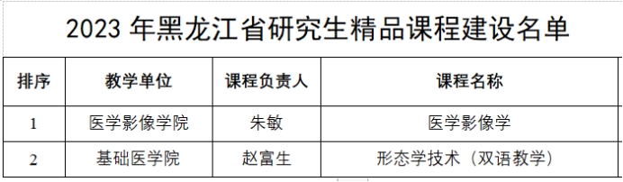 2023年12月18日,根据黑龙江省教育厅下发的《关于2023年度黑龙江省研究生精品课程建设项目评审结果的公示》,黑龙江省教育厅公布了2023年研究生精品课程建设项目立项结果,经过我校遴选申报,我校教师经过层层选拔,最终两项研究生精品课程喜获省级立项。