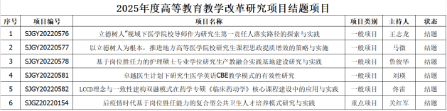 根据《黑龙江省教育厅高等教育教学改革研究项目验收工作的通知》要求,我校对本年度审核符合结题标准的项目开展验收工作。重点项目结题验收标准严格按照《黑龙江省教育厅关于印发 <黑龙江省高等教育教学改革研究项目管理办法> 的通知》(黑教规〔2024〕2 号)执行。一般研究项目由我校按校内管理办法组织结题工作,经学校评审通过后,拟对符合结题要求的项目进行公示。