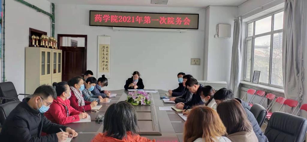 2021年3月4日下午,药学院在四楼会议室召开2021年第一次院务会,会议由院长吴宜艳主持,药学院班子成员、各科室主任和科级干部参加会议。
