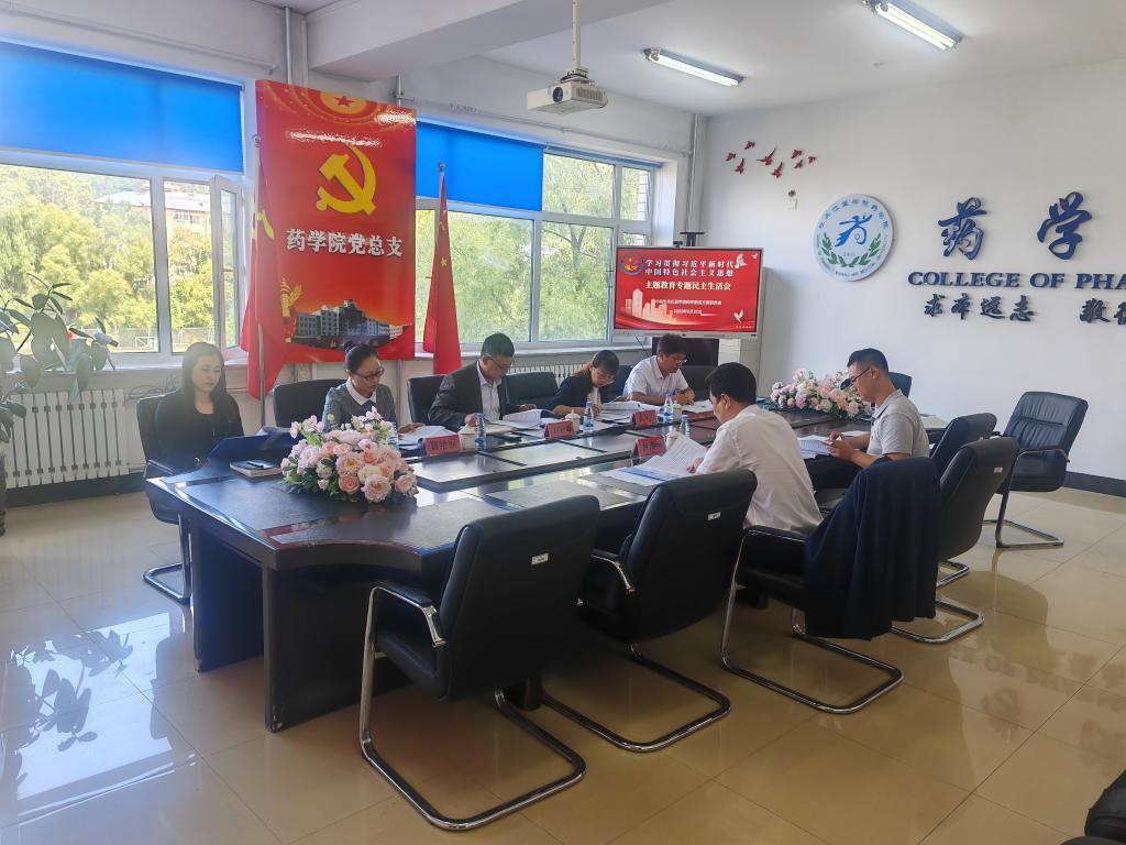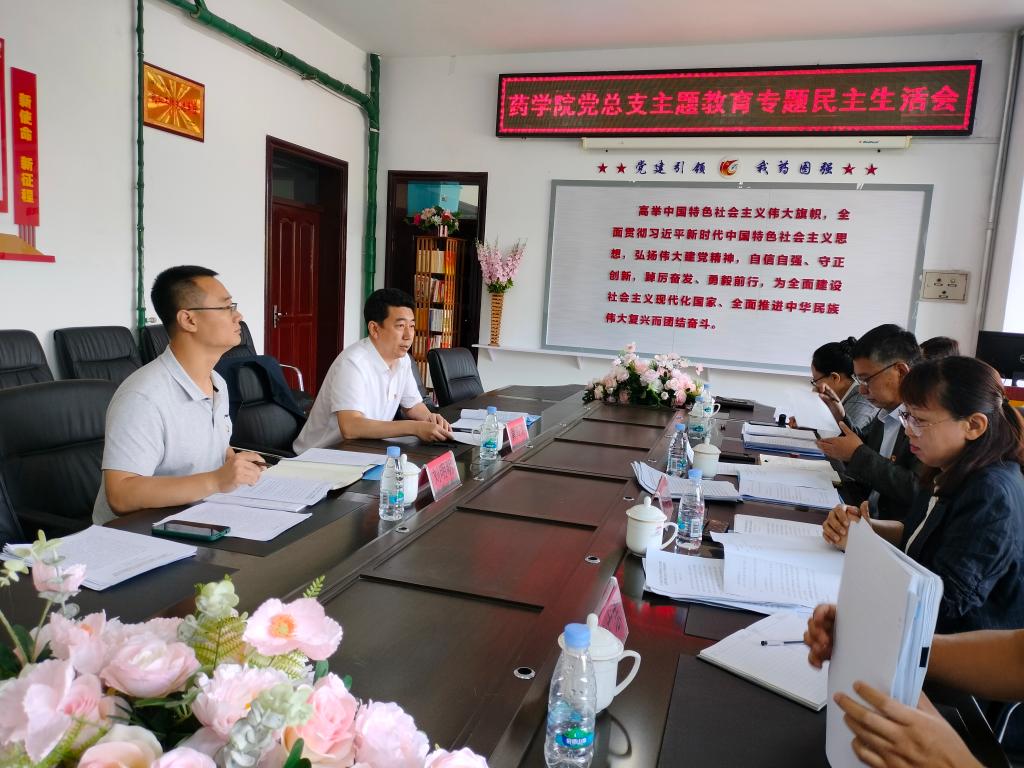 药学院党总支书记刘晓峰主持会议并作总结讲话,学校党委常委、纪委书记、省监委驻牡丹江医学院监察专员黄海涛、学校主题教育领导小组成员刘明明到会指导,黄海涛作点评讲话。