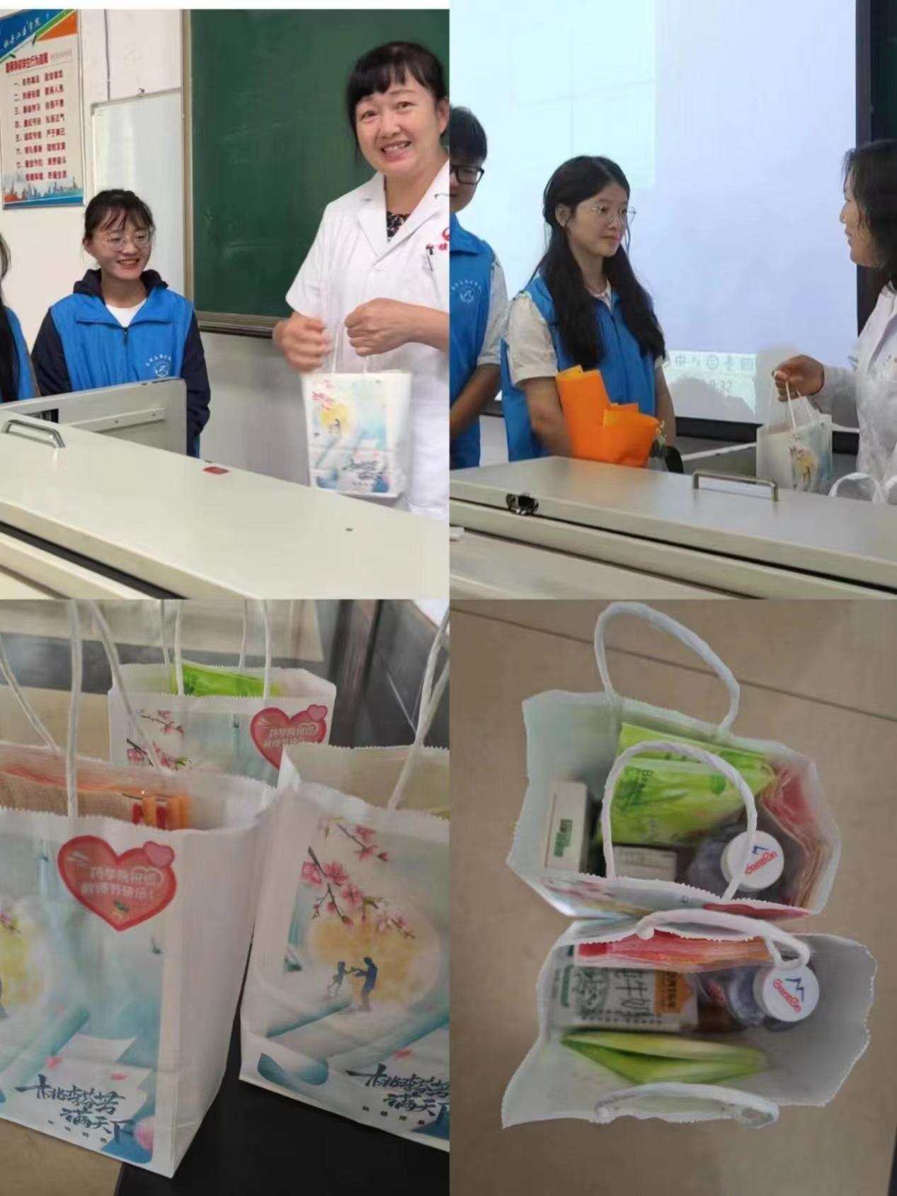 在节前的最后一个工作日,学生们为当天在药学楼内授课的学校各部门所有教师准备了节日慰问品,充满氛围感的礼品袋内装满了小糕点、火腿肠、牛奶、矿泉水、喉宝、纸巾、口罩等课堂常用物品,孩子们细致观察、用心准备,旨在让老师们也能体会到来自学生的温暖。在接过慰问品的那一刻,老师们欣慰的笑容便是我们最大的收获。