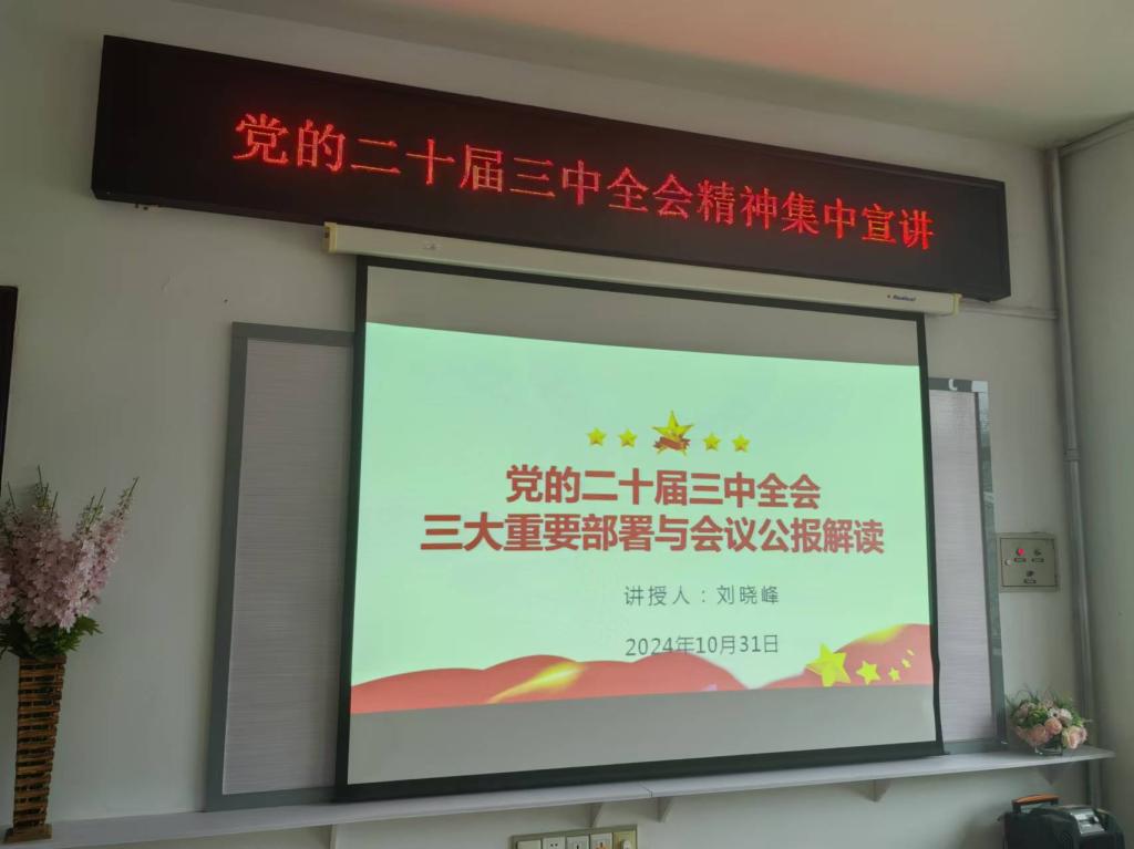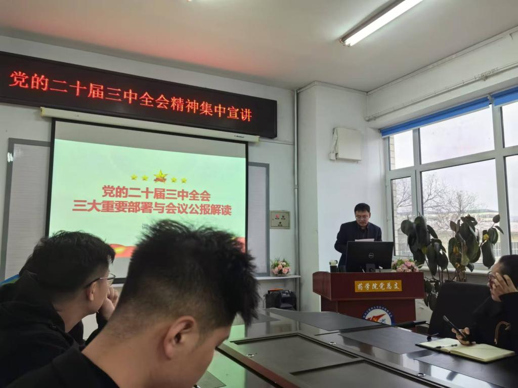 为深入学习宣传贯彻党的二十届三中全会精神,教育引导全院师生深刻领悟全会精神的核心要义、精神实质和实践要求,做到学深学透、入脑入心。10月31日,药学院党总支书记刘晓峰以《党的二十届三中全会三大重要部署与会议公报解读》为题作党的二十届三中全会精神专题宣讲。学院领导班子成员、各职能科室全员,各支部书记、支委、全体辅导员参加学习。