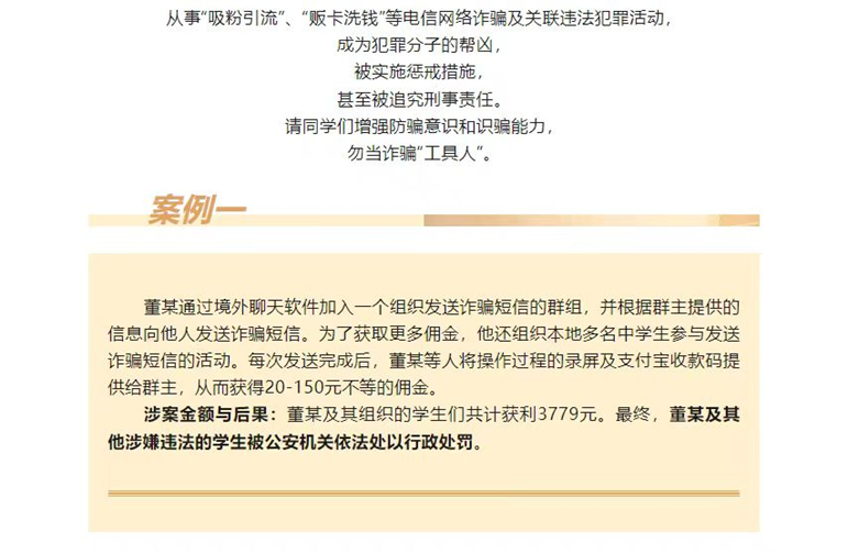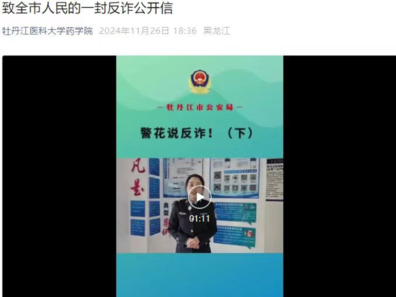 我院充分利用微信公众号、网站、微信群等平台向师生推转反诈宣传公益短视频和警示教育片、典型案例、防骗指南等,以大学生喜闻乐见等形式普及反电诈知识,营造反诈宣传的浓厚氛围,实现反诈宣传教育常态化。