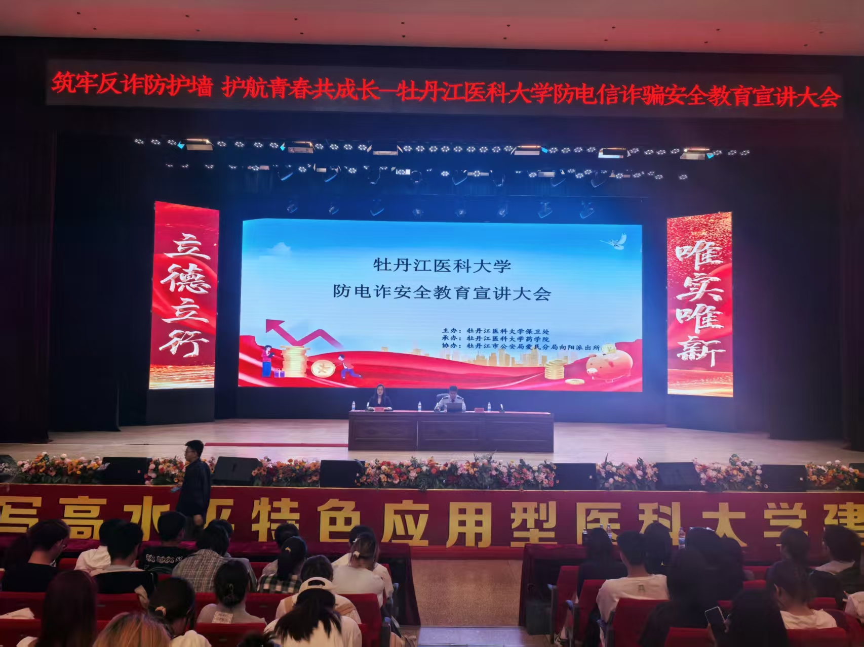 为应对层出不穷的电信网络诈骗手段,提升师生防范意识,切实守护学生财产安全与校园稳定,6月6日,药学院联合校保卫处及市公安局隆重举办“筑牢反诈防护墙,护航青春共成长”安全教育宣讲大会,全校1500余名学生积极参与。会议由药学院副处级辅导员石杰主持。