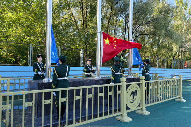 随着国旗护卫队迈着铿锵有力的正步出旗,全场肃静,目光紧紧追随那面承载着民族记忆的五星红旗。在激昂的国歌声中,五星红旗冉冉升起,随后校旗也缓缓升起,全体师生脱帽行注目礼,共同唱响中华人民共和国国歌和牡丹江医科大学校歌。