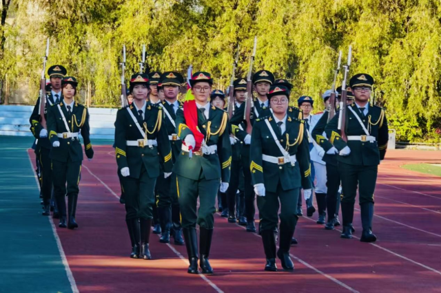 清晨6点40分,全校在校学生以学院为单位整齐列队,肃立于田径运动场升旗台前。